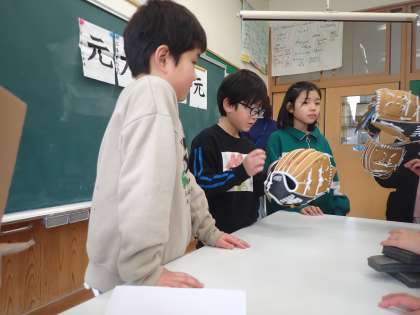 大谷選手から送られたグローブ。全校へのお披露目の後、3年生教室にもグローブが回ってきました。