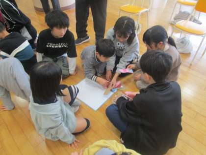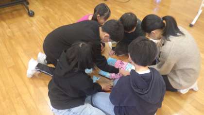 卒業おめでとう集会での4年生の発表は「卒業おめでとうパズル」でした。4年生の子供たちが描いたイラストをパズルにし、なかよし班で取り組みました。全校の力を合わせて、素敵なパズルが仕上がりました。全校でパズルを楽しみ、6年生への感謝の気持ちや頑張ってほしいという気持ちを伝えることができました。