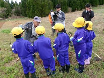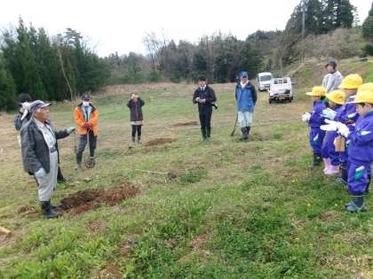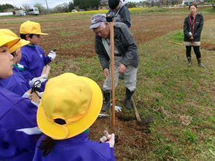 入学して初めての音川交流センター事業に参加しました。天気は曇り空でしたが、一年生は植え方の説明を熱心に聞いた後、土をかけたり、縄を八の字に縛ったりするなど、一生懸命に桜の苗木を植えていました。