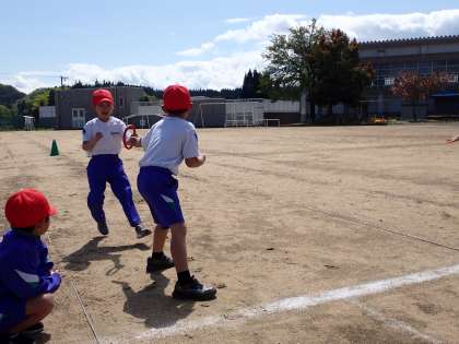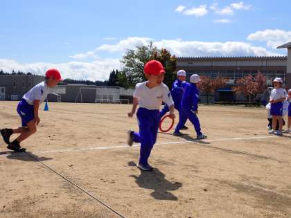 リングバトンを使ってリレーしました。上手くバトンを繋いでいます。