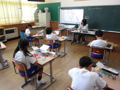「電気のはたらき」の学習です。実験に使うプロペラ制作で難しいところを、全員でプロジェクターを使って確認しながら作っているところです。これからどんな実験をしようかな。