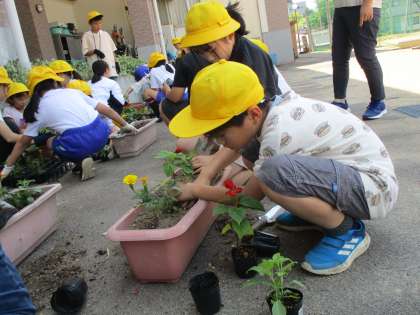 今日の「のびのびタイム」は、なかよし班の仲間と一緒にプランターに花の苗を植えました。明日からは、毎朝の水やりを忘れず行い、綺麗な花をたくさん咲かせましょう。