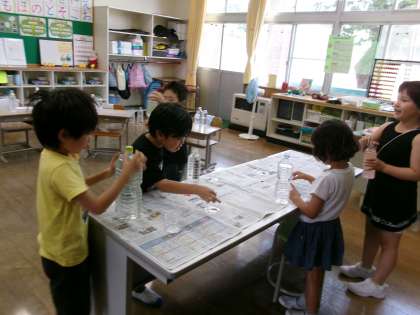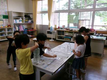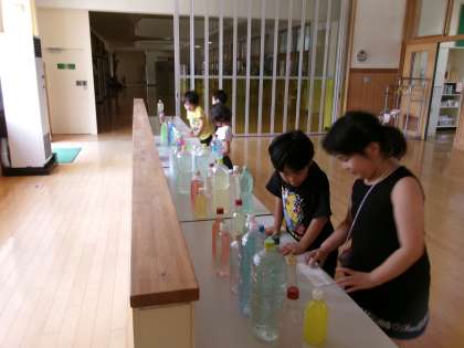 図画工作科で「カラフルいろみず」の学習をしました。ペットボトルのふたに好きな色の絵の具をつけてふりふり、素敵な色水が沢山できました。