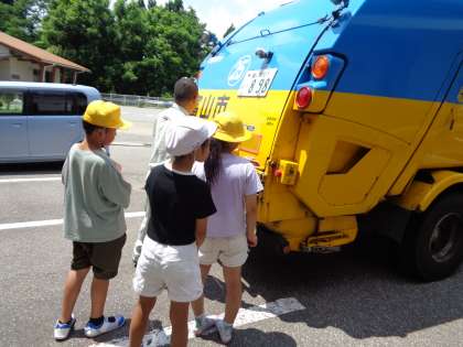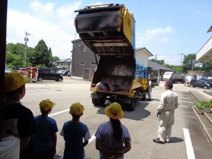 3R推進スクールでは、ものを長く大切に扱ったり、ごみを正しく分別したりすると、地球環境を守ることにつながると学びました。また、自分たちの生活ごみを回収しているごみ収集車を近くで見ることで、たくさんの家庭ごみを車に積み込む仕組みについて知ることができました。