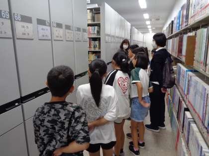 また、書庫や図書館も見学しました。学校の図書室よりもはるかにたくさんの本が大きな棚に整理されて置かれている様子が、子供たちにとってとても新鮮なようでした。