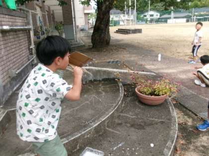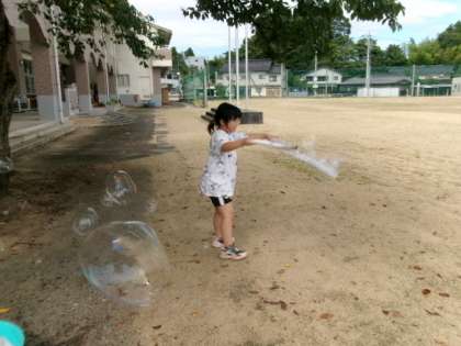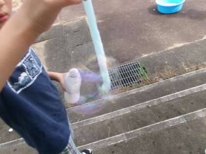 生活科「じぶんの とっておき しゃぼん玉」で遊んでいる様子です。「大きなしゃぼん玉できたよ。」「みて みて 不思議なしゃぼん玉ができたよ。」「段ボールのあなから細かいしゃぼん玉がたくさんできたよ。」と大喜びです。