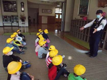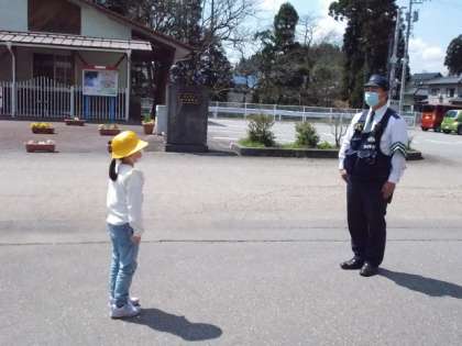 1・2年生合同で、交通安全教室を行いました。音川交番の巡査さんに来ていただき、交通安全のお話を聞いたり、教わったことを生かして歩道を歩いたりしました。