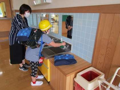 登校後は、すぐに手洗いです。「新しい学校生活様式」に早く慣れてくださいね。