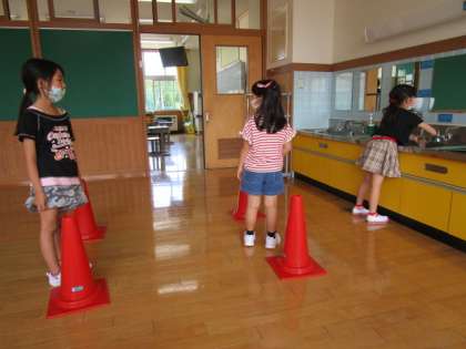 昨日、帰る前の時間に手を洗う時のルールとトイレに行く時のルールを1年生に話しました。今日、様子を見ていると、早速そのルールを守って、カラーコーンを目印にして並ぶ1年生の姿が見られました。しっかりと話を聞き、行動に移そうとする立派な態度でした。
