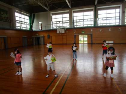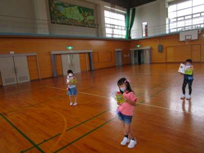 音楽科の時間に、教室でたくさんの歌を聴いた後、1年生は体育館で実際に歌ってみました。たくさんの動物が出てくる歌を歌った子供たちは、「これ知ってる」「これは歌えるよ」と音楽に合わせながら歌っていました。