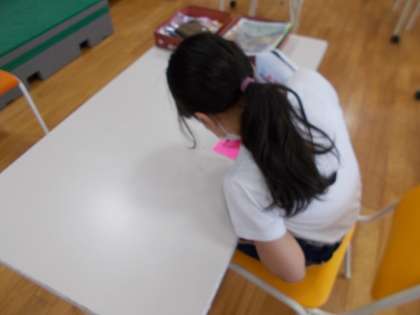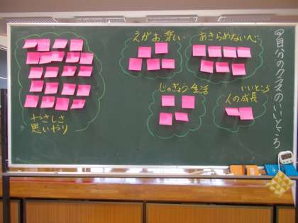「いろんなことに挑戦して、あきらめないこと」「励ましたり、心配してくれるやさしいところ」「みんなを笑わせてくれる楽しいところ」等、たくさんのいいところを見付けていました。