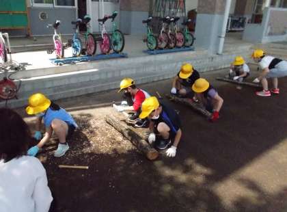 しいたけの駒菌打ちを行いました。初めて金づちを使う子もいましたが、上手に打ち込んでいました。4年生の春に収穫できる日を楽しみに、原木を持ち帰りました。