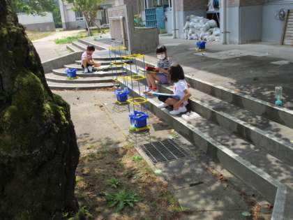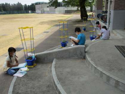 どんどん育ってきているあさがおについて、今日は教室で話合いをしてから観察しました。「どんなあさがおに育ってほしいかな」「どうすればそんなあさがおになるかな」と問いかけ、子供たちはそれぞれに話をしてくれました。葉や茎の色や形まで、よく見てあさがおに話しかけるように描いている子もいました。