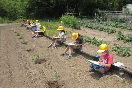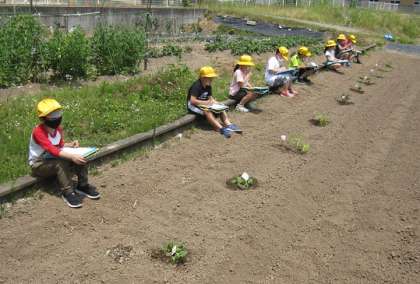 畑で野菜の観察をしました。葉の表と裏の様子や、茎の色の違いなどに注目しながら、丁寧に観察カードを仕上げました。