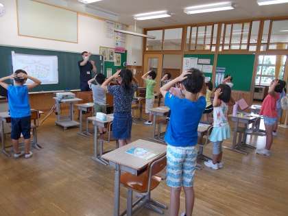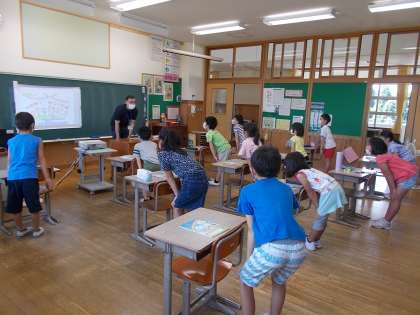 今日は外国語活動がありました。ALTの言葉に合わせて身体を動かしたり、英語であいさつをしたりしました。