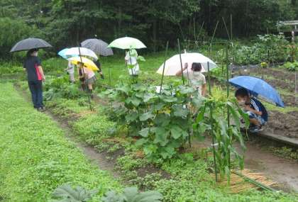 今日はあいにくの雨模様でしたが、子供たちの希望で、畑の様子を見に行きました。雨水を吸い込んで、いつもよりも瑞々しい葉の様子に気付いたり、雨粒を避けながら、一生懸命野菜を収穫するなど、晴れの日とは違う体験をすることができました。