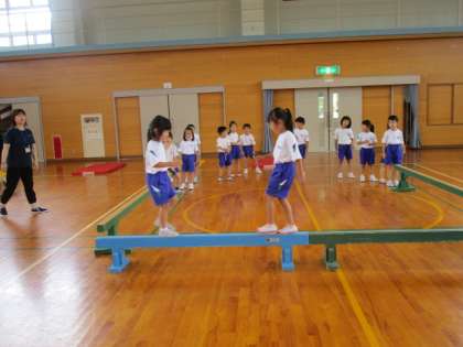 体育の時間に今日は平均台を使ってバランスをとるゲームをしました。最初にみんなで平均台を渡った後、2グループに分かれてどんじゃんけん(相手陣地を目指してじゃんけんをして進むゲーム)をしました。