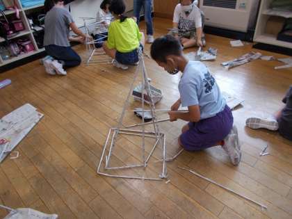 今日は図工の時間に新聞紙を使って教室に町を作りました。