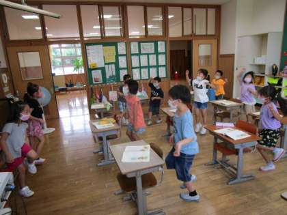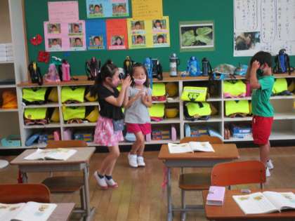1年生はおおきなかぶの後、おむすびころりんの音読に取り組んでいます。今日は、「おむすびころりん すっとんとん」をどう読むか話し合い、実際に動きを付けて読んでみました。踊りながらおじいさんやねずみになりきって読む子供たちがすてきでした。