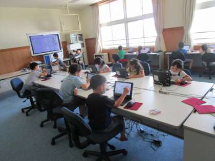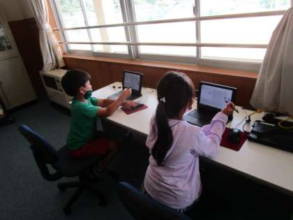 1年生は昨日、情報モラルの学習をした後、今日は実際にコンピュータを使うことに挑戦しました。電源のオン・オフの仕方を練習した後は、学校のホームページを見たり、ソフトを使ってパソコン上で絵を描いたりすることを楽しみました。オンラインでの学習の機会に備えて、準備を進めています。