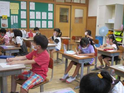 子供たちは、それぞれ1学期を振り返って、「これが楽しかったな」「2学期はこれをがんばりたいな」と思いを述べ、文章に書き残していました。
