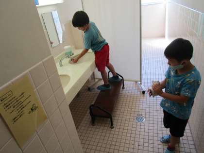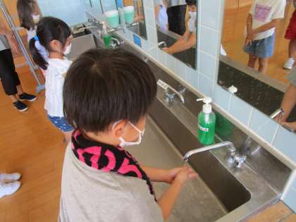 1年生はトイレと手洗い場での手の洗い方を確認し、動き出す前にハンカチで手を拭くということを実際にやってみました。普段からどの子も手をとても丁寧に洗っていましたが、ポケットにハンカチがなかったり、手をふって水滴がとんでいたりすることがあったため、ハンカチで手を拭くことについて話しました。毎日コロナウイルス対策で手洗いを励行していますので、学年問わずハンカチを必ず持たせていただきますようよろしくお願いします。