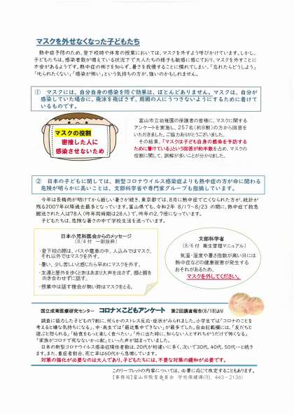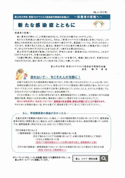 富山市教育委員会より、「新型コロナウイルス感染症対策検討会議だよりVOL.6」が届きました。「子どもの感染について」「学校関係者の感染が分かったら」等の記事が掲載されています。本日子供たちに配付しましたので、ご確認ください。