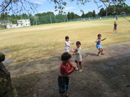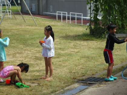 1年生は今日、2回目の水遊びをしました。今回は前回よりパワーアップして、家からいろいろなものを持ってきたり、自分で工夫して道具を使って遊んだりする姿が見られました。
