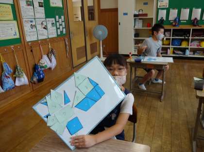 算数科「さんかくやしかくの形をしらべよう」の学習で、三角形は「3本の直線でかこまれた形」、四角形は、「4本の直線でかこまれた形」であることを学習しました。曲がった辺を直線にしたり、あいているところを閉じたりして、三角形や四角形に直した形を使って、いろいろな形を作りました。
