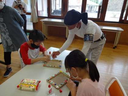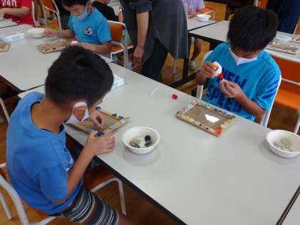 ものづくり教室で、タイルアートを教えていただきました。様々な色、形、大きさのタイルに目を輝かせながら、子供たちは夢中になって、写真立てにタイルを飾っていました。葉っぱで形を作ったり、ハートを付けて可愛くしたりして、お気に入りの作品が仕上がり、大満足でした。