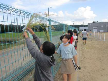 地域の方から教えていただいたことをもとに、各自がバケツで栽培していた「バケツ稲」の稲刈り・はさがけをしました。
