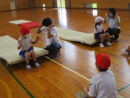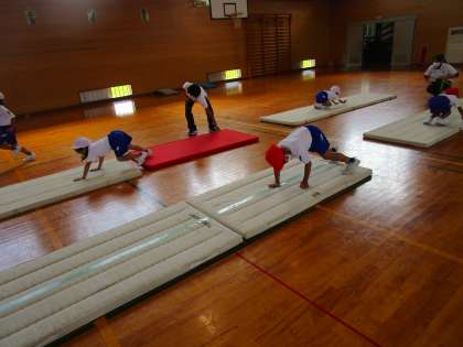 今日は、マット運動教室がありました。1年生は2年生と一緒に前まわりりと後ろまわりが上手になるように、様々な動きを教わりました。最後は、後ろまわりが以前より上手になり、満足そうな1年生でした。