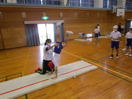 マット運動教室がありました。倒立前転や側方倒立回転がきれいにできるよう、指導員の方が、一人一人に合ったアドバイスをしてくださいました。