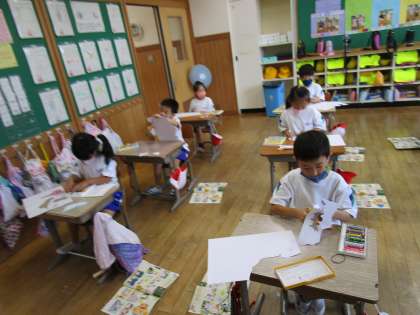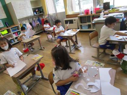 1年生は画用紙を切った形からどんなものができるかを考え、作品にしました。つくりたいものによって色画用紙や白い画用紙等、色までこだわって作りました。