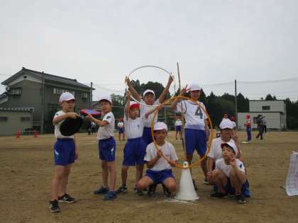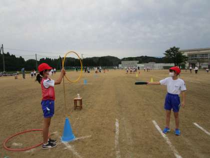 「リングドッジビー」では、自分たちで距離を選び、フラフープの中にドッジビーをくぐらせます。高学年が下級生にどこから投げるか、アドバイスしていました。そのおかげで、どのチームも練習よりも高得点を出すことができました。