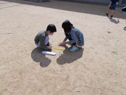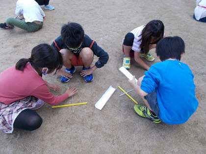 理科の学習で、日なたと日かげの地面の温度を測りました。温度計にまっすぐに目線を合わせて温度を測っていました。
