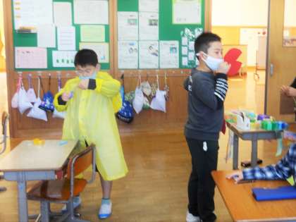 学習発表会の「スイミー」の練習を進めるうちに、「海の生き物たちの衣装をつくりたい」という声が子供たちからあがったので、みんなで協力して作りました。クラゲ、伊勢エビ、魚、昆布やわかめ…子供たちが考えて作った衣装で、よりいっそうすてきな海の世界が表せるといいです。