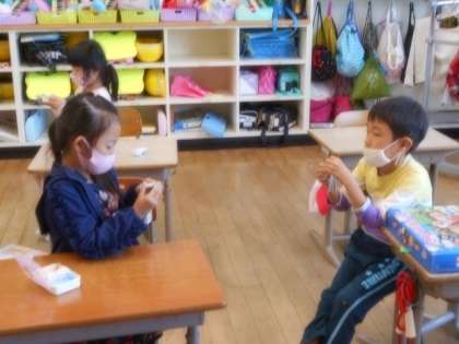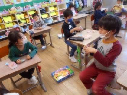 計算カードを使って、たし算の問題を出し合っています。10のまとまりをつくって、素早く計算できるようにがんばっています。