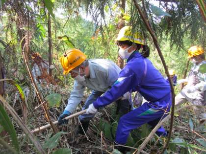 大瀬谷地区に林業体験に行って来ました。地域の方々や林業に携わる方に教えていただきながら、下刈りを行いました。子供たちは、大きな鎌を持ちながら一生懸命に草を刈っていました。