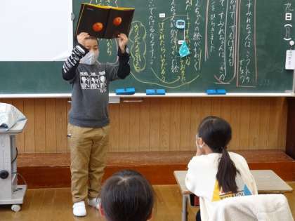 昼休みに、給食係が「食べ物クイズ」を行いました。キュウリだと思ったら、バナナだったり、ミカンだと思ったらトマトだったり、不思議な食べ物の登場に、びっくり。思いがけない食べ物の変身をみんなで楽しみました。
