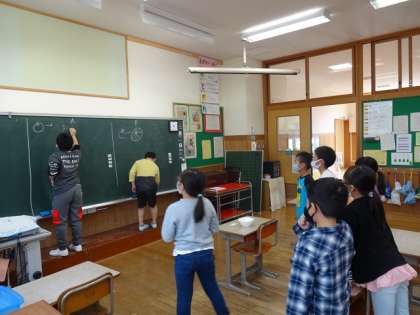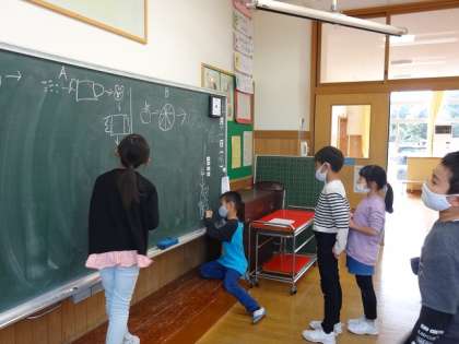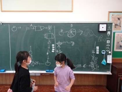 のびのびタイムに、黒板係が「絵しりとり大会」を開きました。黒板にかかれた絵だけを頼りに、しりとりを続けるのですが、「リスだと思ったらパンダたった」など、大爆笑のしりとりがたくさん。みんなで楽しいひとときを過ごしました。