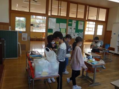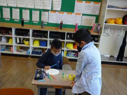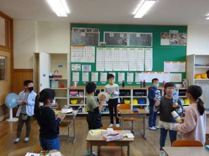 図画工作科「ときめきコンサート」の学習で、身の回りのものを使って、自分だけの楽器を作りました。作った楽器で演奏会を開き、みんなのりのりで楽器の演奏を楽しみました。
