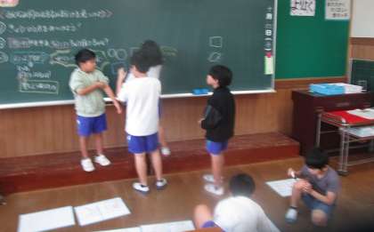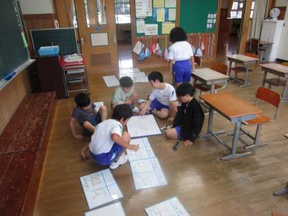 みんなが同じ仲間分けになる条件は何だろうか、子供たちは、ホワイトボードを見比べ話し合い、何度も仮説を出しては確かめていました。条件を見付けたとき、「やったあ!見付けることができたぞ!」「これなら絶対みんな同じになると思ったんだよね!」と喜び合いました。