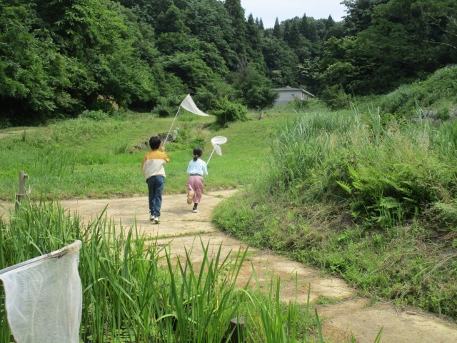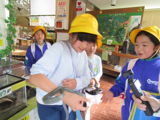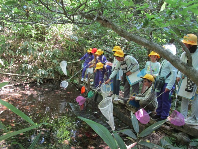 ねいの里の見学に行きました。トンボやオタマジャクシを捕まえたり、アオダイショウを触ったりしました。音川地区の豊かな自然に興味をもち、進んで生き物や植物と触れ合う姿が見られました。