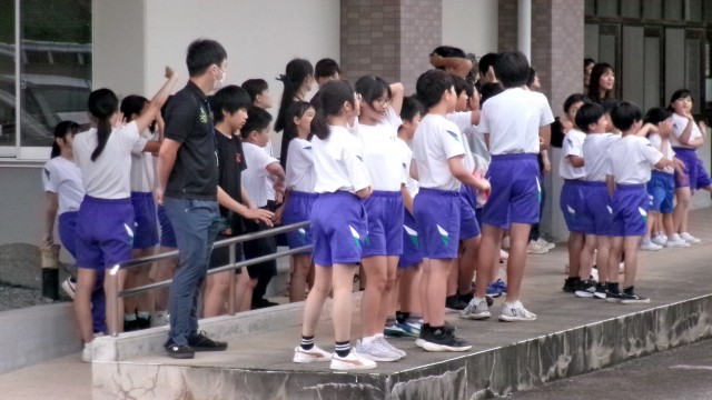出発式のあと、他の学年の子どもたちの盛大な見送りを受けて、青少年の家へ出発しました。