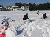 青空のもと、1,2年生がグラウンドで雪遊びをしました。鉄棒やうんていが埋まるほ...