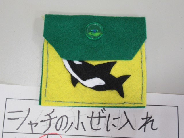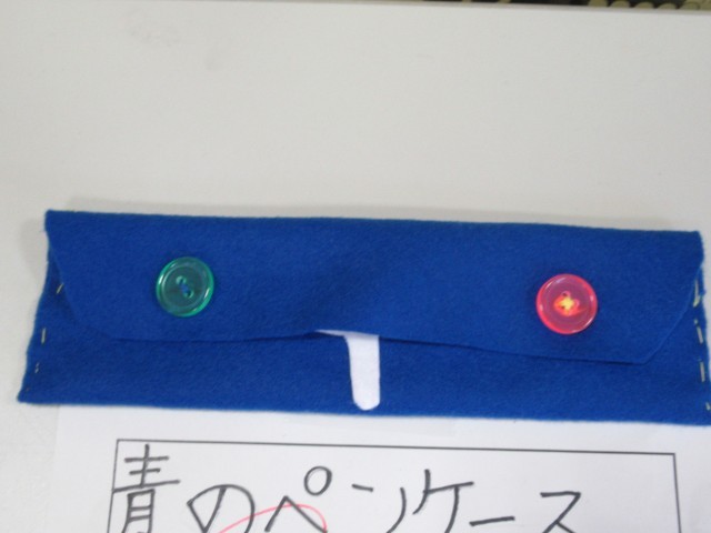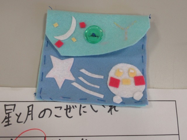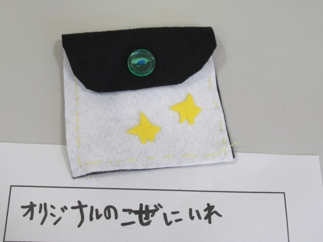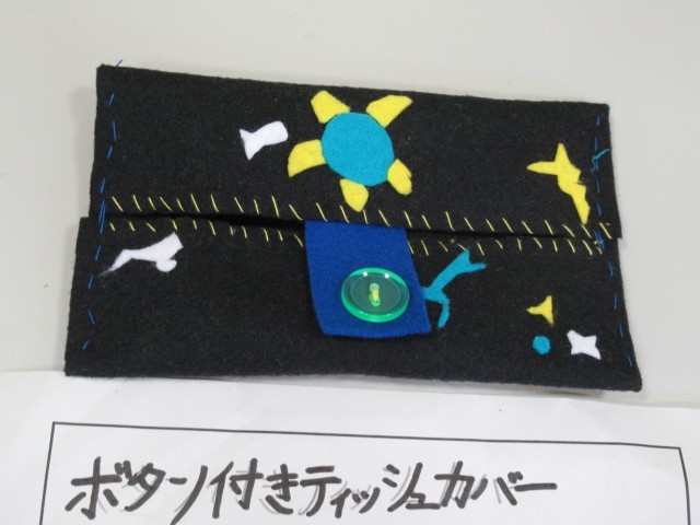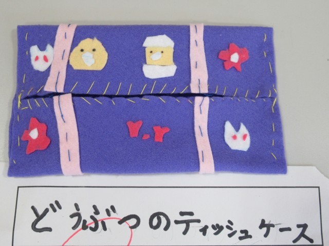 5年生教室前廊下を通ると、家庭科の小物入れの展示作品が増えていました。