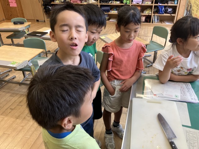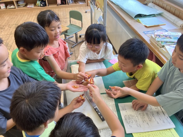 2年生の生活科で野菜の観察に畑に行くと、あおぞら級のミニトマトが2つ赤くなっていました。すると「これは2年生に食べてもらいたい。1粒を4つに分ければみんなで食べれるよね」とみんなに話しました。2年生の子供たちはみんな大喜び。みんなでトマトで乾杯して食べました。「いつものトマトより100倍美味しい」「1000倍だよ」「ありがとう」「ぼくのきゅうりも今度とれたら半分あげるね」と嬉しいシャワーをたくさん浴び、にこにこでした。心が温かくなる時間でした。