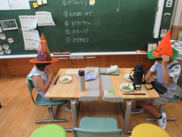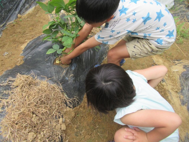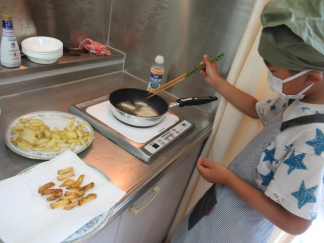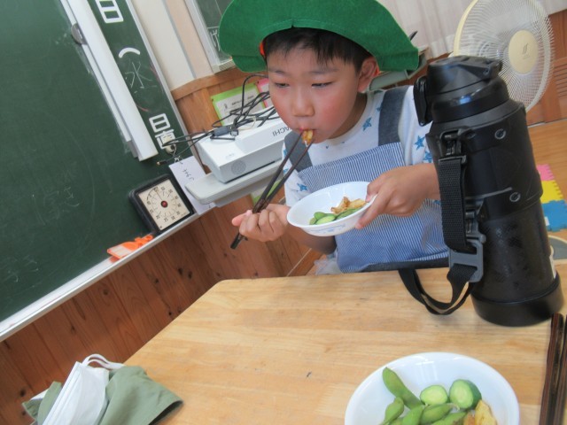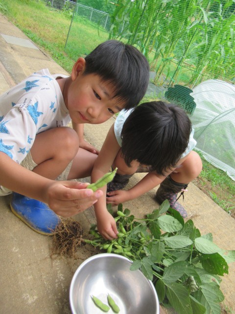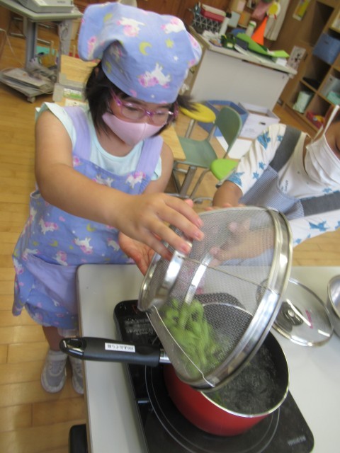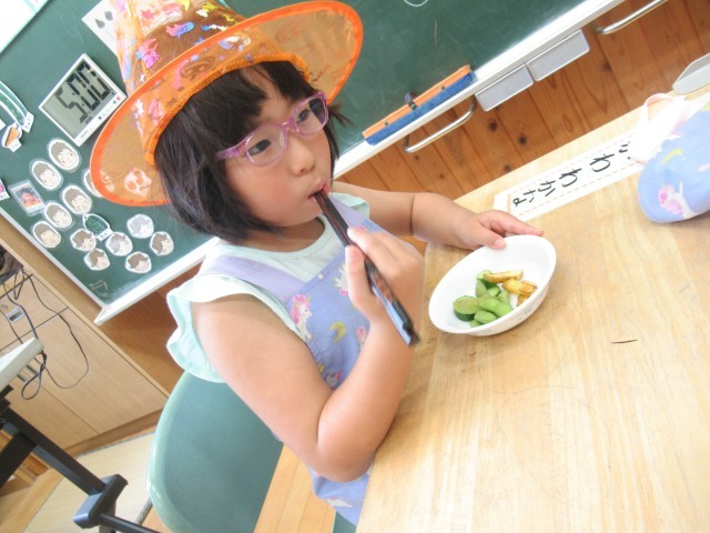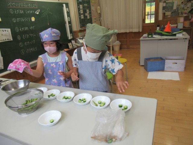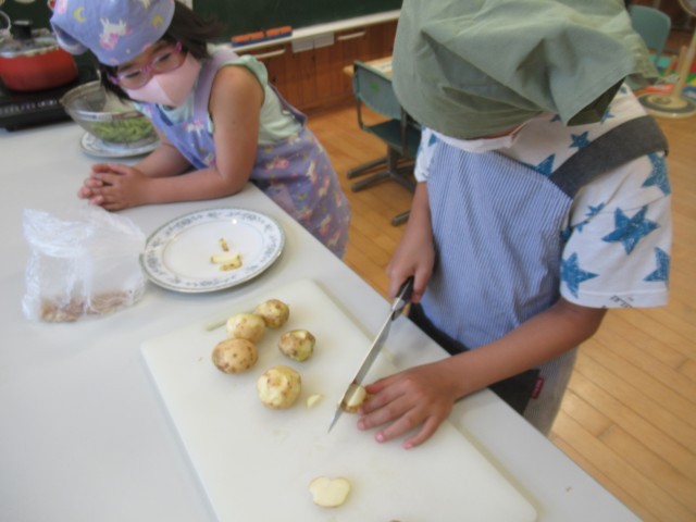 今日は、楽しみにしていた野菜パーティーでした。先日収穫したジャガイモ、今朝採れたての枝豆をクッキングして食べました。「家で豆を洗ったことあるよ」とざるとボールを使って手際よく洗う子供、「包丁一人で使ってみたい」とチャレンジする子供、それぞれ自分ができること、やってみたいことを進んで行いました。自分たちで育てた野菜の味は、格別でした。友達や先生にも食べてもらいたいと招待しました。「みんなおいしいって言ってくれて、うれしかった」と振り返っていました。