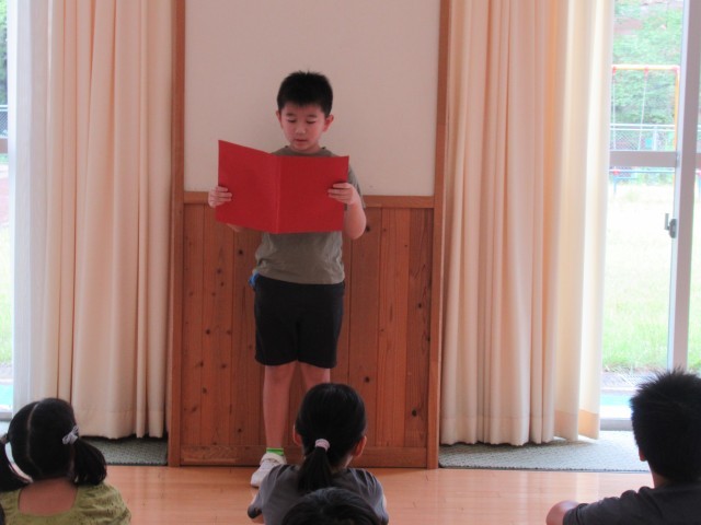 児童を代表して、4年生男児が2学期に頑張りたいことをみんなの前で発表しました。